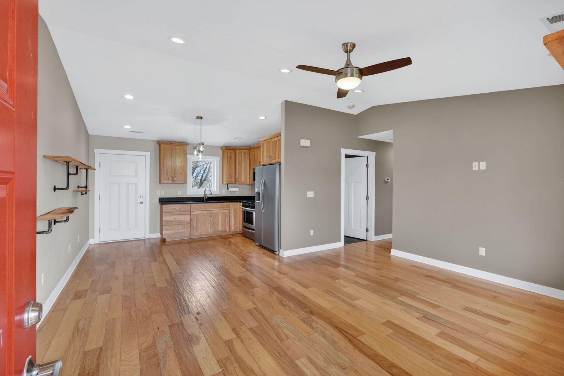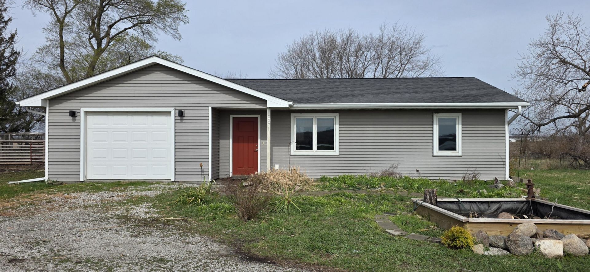 Modern ranch-style home built in 2017 on 3.49 acres just south of Ellsworth offers easy living with no steps and everything on one floor. This 2 bed, 1 bath home features an open floor plan with comfortable living and kitchen spaces, natural wood cabinetry, stainless steel appliances, a gas stove, and an attached garage. The bathroom includes tiled floors, a walk-in shower, and stack washer/dryer. Outside you'll find a koi pond and rear patio space, along with a rustic barn, chicken coop, and an outbuilding with stalls. The outdoor space offers the freedom to make it your own, whether you're looking for space for chickens, goats, horses, gardening, or simply room to enjoy the outdoors. Paved road access and easy access to I-35 make commuting convenient.